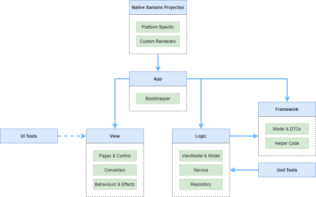 Your main business logic, including ViewModels and Models, will be located in here. The interesting point to note here, is there will be NO Xamarin Forms reference. This is key, if you want an easy time setting up Unit Tests. Inside the Logic app you will also want to include a Service Layer and Repository Layer. These can be branched out into separate projects if you need to, but generally it’s easy to keep them in the same app.